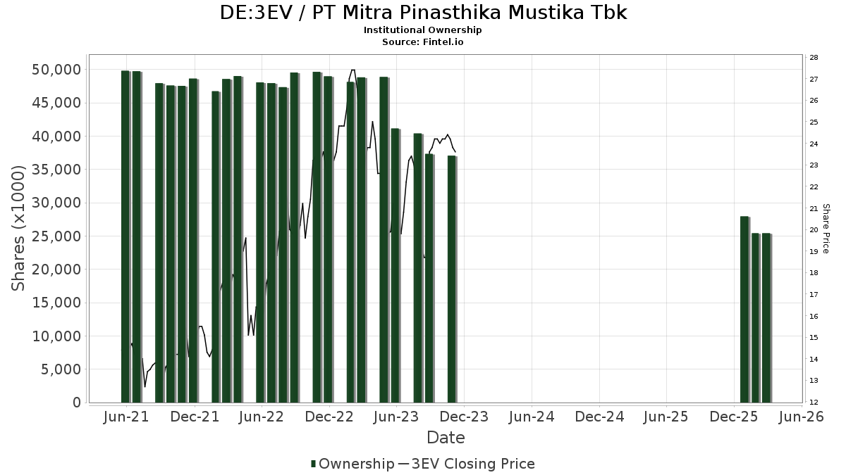 PT Mitra Pinasthika Mustika Tbk (DB:3EV) institutionel ejerskabsstruktur viser aktuelle positioner i virksomheden efter institutioner og fonde, samt seneste ændringer i positionsstørrelse. Større aktionærer kan omfatte individuelle investorer, investeringsforeninger, hedgefonde eller institutioner. Skema 13D angiver, at investoren besidder (eller besidder) mere end 5 % af virksomheden og har til hensigt (eller har til hensigt at) aktivt at forfølge en ændring i forretningsstrategi. Skema 13G indikerer en passiv investering på over 5%.