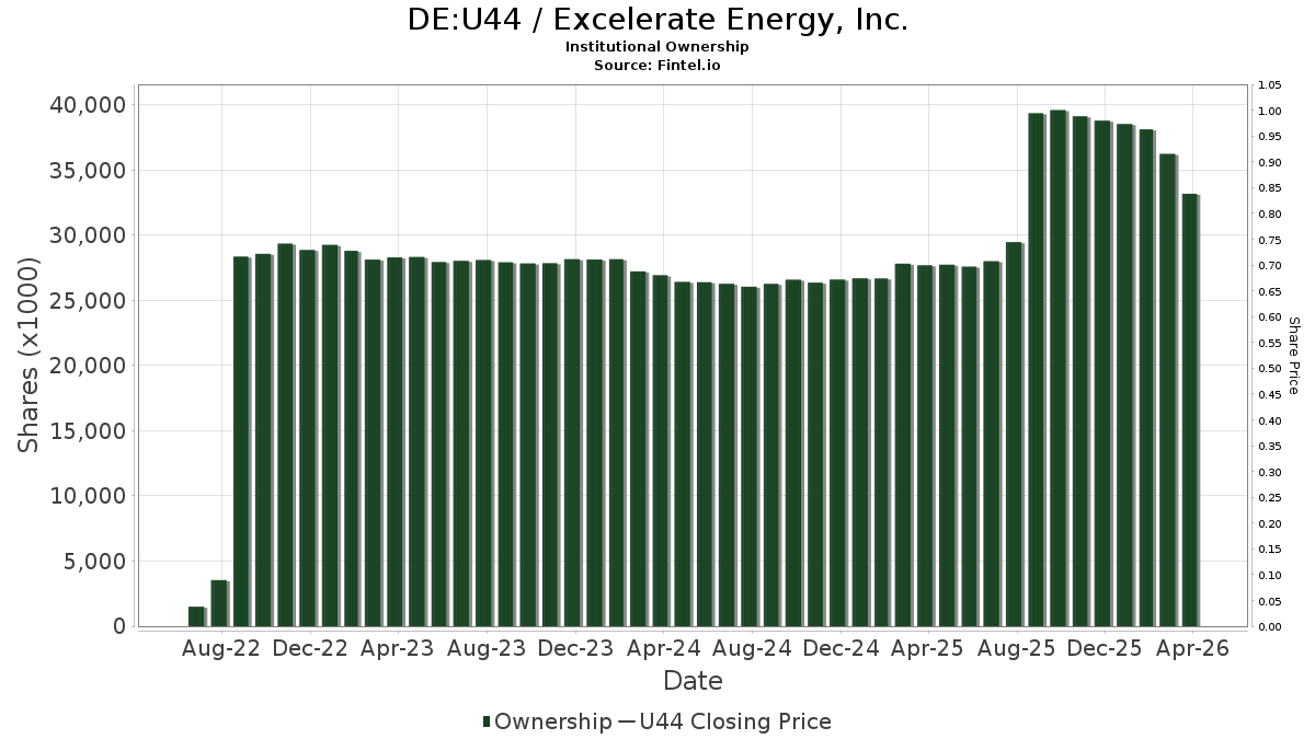 Excelerate Energy, Inc. (DUSE:U44) institutionel ejerskabsstruktur viser aktuelle positioner i virksomheden efter institutioner og fonde, samt seneste ændringer i positionsstørrelse. Større aktionærer kan omfatte individuelle investorer, investeringsforeninger, hedgefonde eller institutioner. Skema 13D angiver, at investoren besidder (eller besidder) mere end 5 % af virksomheden og har til hensigt (eller har til hensigt at) aktivt at forfølge en ændring i forretningsstrategi. Skema 13G indikerer en passiv investering på over 5%.